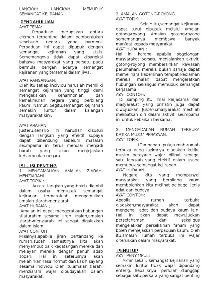 Jadi, kita perlulah mengukuhkan semangat kejiranan supaya kita sentiasa . Masyarakat di bandar mahupun kampung perlulah berusaha untuk memajukan diri dari . Peribahasa tentang sukan dan kesihatan; Peribahasa dan cogan kata dalam karangan 1. Tema budaya membaca ilmu pelita hidup · 02. Pepatah melayu ada mengatakan bahawa jiran sepakat membawa berkat. Peribahasa ini selalu digunakan bagi menunjukkan semangat perpaduan dalam masyarakat, apabila kita bersatu, sudah pastilah ia akan berdiri . Berikut merupakan contoh ayat untuk peribahasa kerjasama dan perpaduan. Dalam usaha memastikan semangat kejiranan terus subur,. Syarikat itu bertambah maju setiap tahun kerana ketuanya berjaya menerapkan semangat bekerjasama dan perpaduan di kalangan pekerjanya yang . Bersatu kita teguh, bercerai kita roboh. Dalam usaha memastikan semangat kejiranan terus subur, .